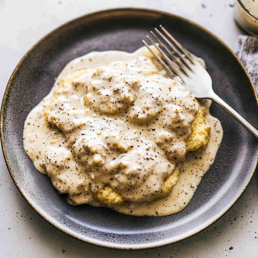 Keywords: - For added flavor, let the sausage brown well before adding milk for the gravy. - Feel free to substitute sausage with bacon or add cheese to your biscuits for a unique twist. - Store leftovers in an airtight container and reheat gently with a splash of milk.