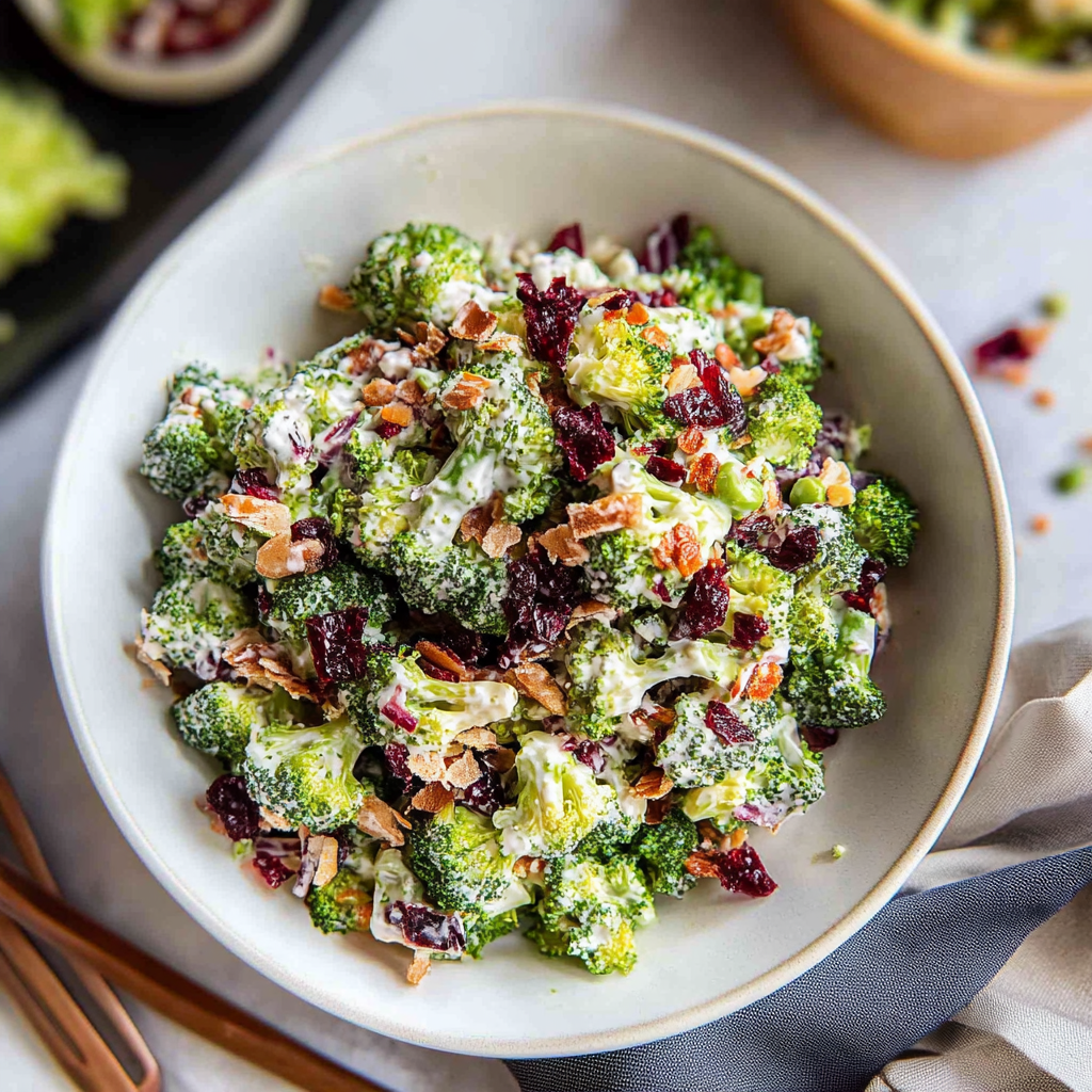 Keywords: - For extra crunch, consider blanching the broccoli for 2-3 minutes before plunging it into ice water. - Customize by adding nuts or swapping cranberries for your favorite dried fruit. - Store in an airtight container in the fridge for up to three days; best enjoyed cold.