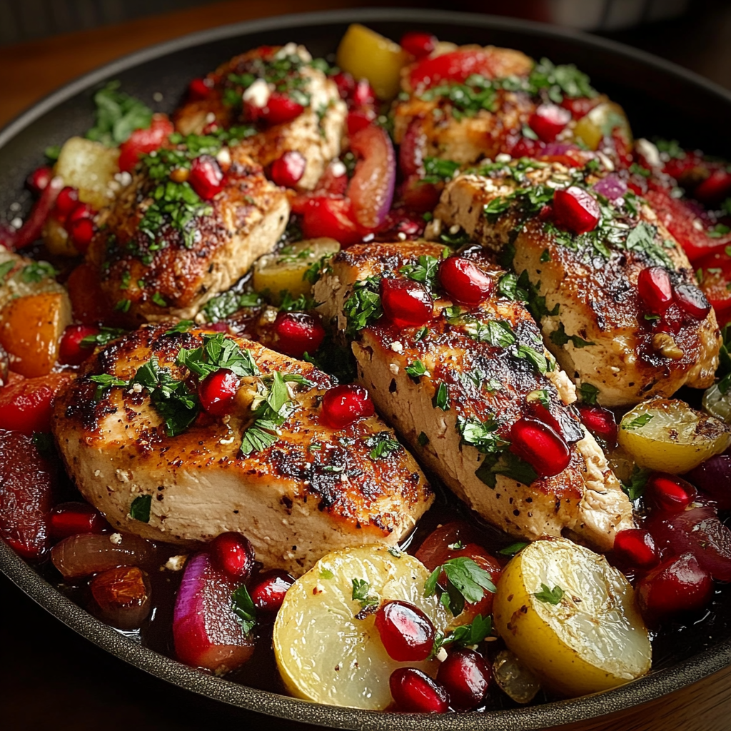 Add Feta and Pomegranate Seeds: Sprinkle crumbled feta over the chicken along with pomegranate seeds. Let them mingle in the pan for about 5 minutes until the cheese softens.