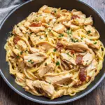 Chicken Carbonara is a creamy pasta dish featuring chicken, cheese, and pancetta in rich sauce.