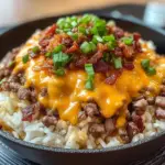 Bacon Cheeseburger Rice Skillet is a delicious one-pan meal that combines the beloved flavors of a classic cheeseburger with fluffy rice. This comforting dish features crispy bacon, savory ground beef, and gooey melted cheddar cheese, creating a satisfying dinner that delights both kids and adults alike. Quick to prepare and bursting with flavor, it’s perfect for busy weeknights or casual family gatherings.