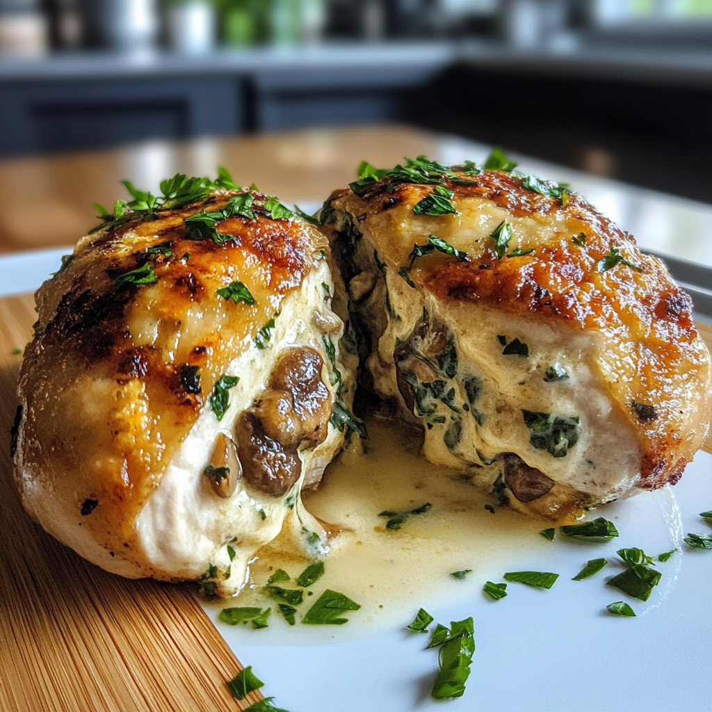 Indulge in the delightful Cheesy Garlic Butter Mushroom Stuffed Chicken, where tender chicken breasts are filled with a savory blend of garlic-infused mushrooms and gooey cheeses. This dish is not only simple to prepare but is perfect for impressing guests at any gathering. With its golden crust and mouthwatering aroma, it promises to be a family favorite that will have everyone clamoring for seconds.