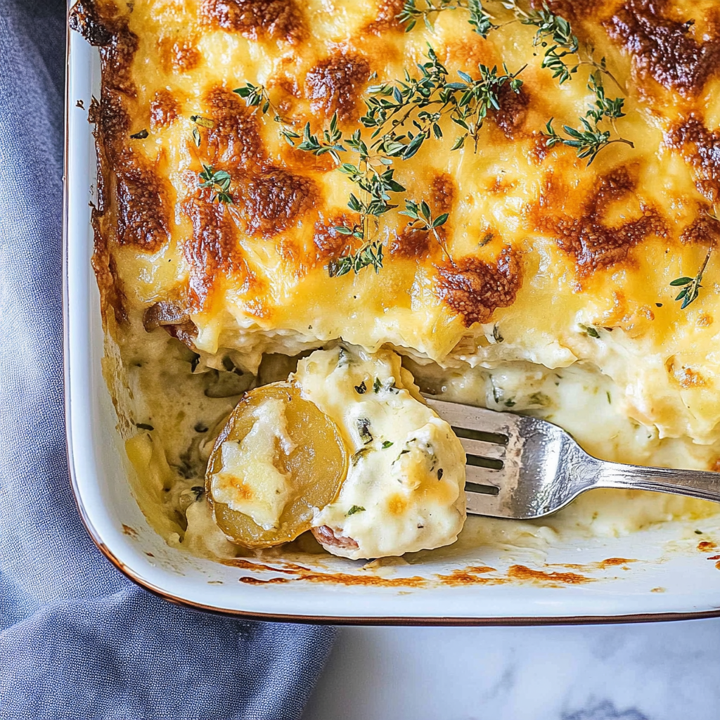 Repeat layering: Add another layer with the remaining potato slices followed by the rest of the cream mixture. Top it off with any leftover cheese (because more cheese is always better), then sprinkle some fresh thyme if using.