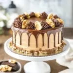 Top with the second layer before slathering more frosting around those sides too (you can never have too much)! Finally drizzle ganache over everything like you’re creating edible art—garnish with extra chopped peanuts if desired.