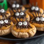 Add Spider Legs and Eyes: While still warm, press pretzel sticks into each cookie for legs and stick on candy eyes before they set completely. Your spiders will look adorable!