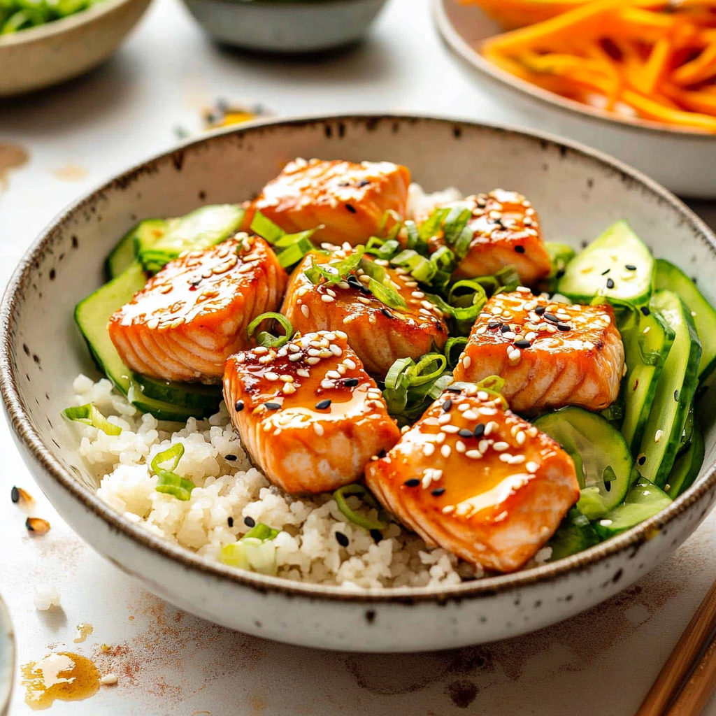 - Assemble bowls with rice as the base, top with salmon, drizzle remaining sauce, and add stir-fried veggies.