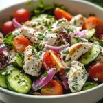 Mediterranean Delight: Tzatziki Chicken Salad is a refreshing and vibrant dish that combines juicy grilled chicken with a creamy tzatziki sauce made from Greek yogurt, crisp cucumbers, and fresh herbs. Perfect for summer gatherings or quick weeknight dinners, this salad is not just a meal but an experience that brings joy with every bite.