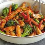 Sweet Chili Chicken Veggie Stir-Fry is like a party in your mouth, where the flavors cha-cha together in perfect harmony. Imagine tender chicken dancing with crunchy veggies while sweet chili sauce serenades them with its delightful sweetness and a hint of heat.