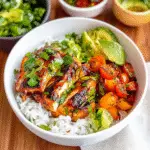 Assemble Your Bowls: In each serving bowl, start with a layer of rice. Top generously with sliced chicken, sautéed peppers, diced avocados, cilantro leaves, and a dollop of sour cream or Greek yogurt.